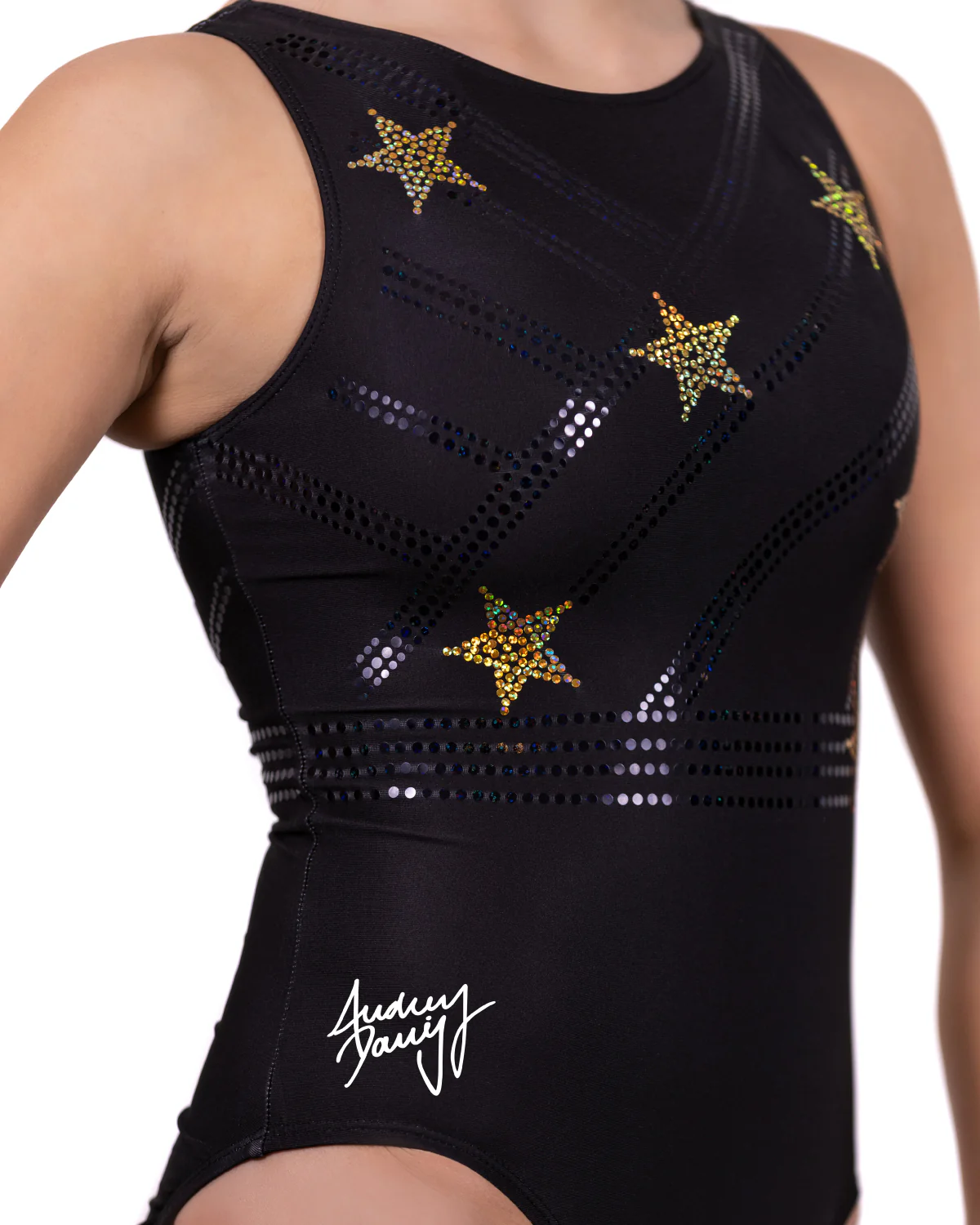 Audrey Davisās Shooting Star leotard reflects her belief that every athlete carries a powerful star within: strong, graceful, and capable of extraordinary things. Inspired by the idea that beauty can shine brightly while still carrying sharpness and attitude, this design captures the balance between elegance and competitive edge. A black sublimated base sets the stage for gold spangle stars that light up the front with bold brilliance. Misty black cross straps and black spangle details on both the front and back add sleek definition, anchored by a shimmering black spangle beltline. Radiant yet fierce, Shooting Star empowers gymnasts to embrace their inner light and compete with confidence.